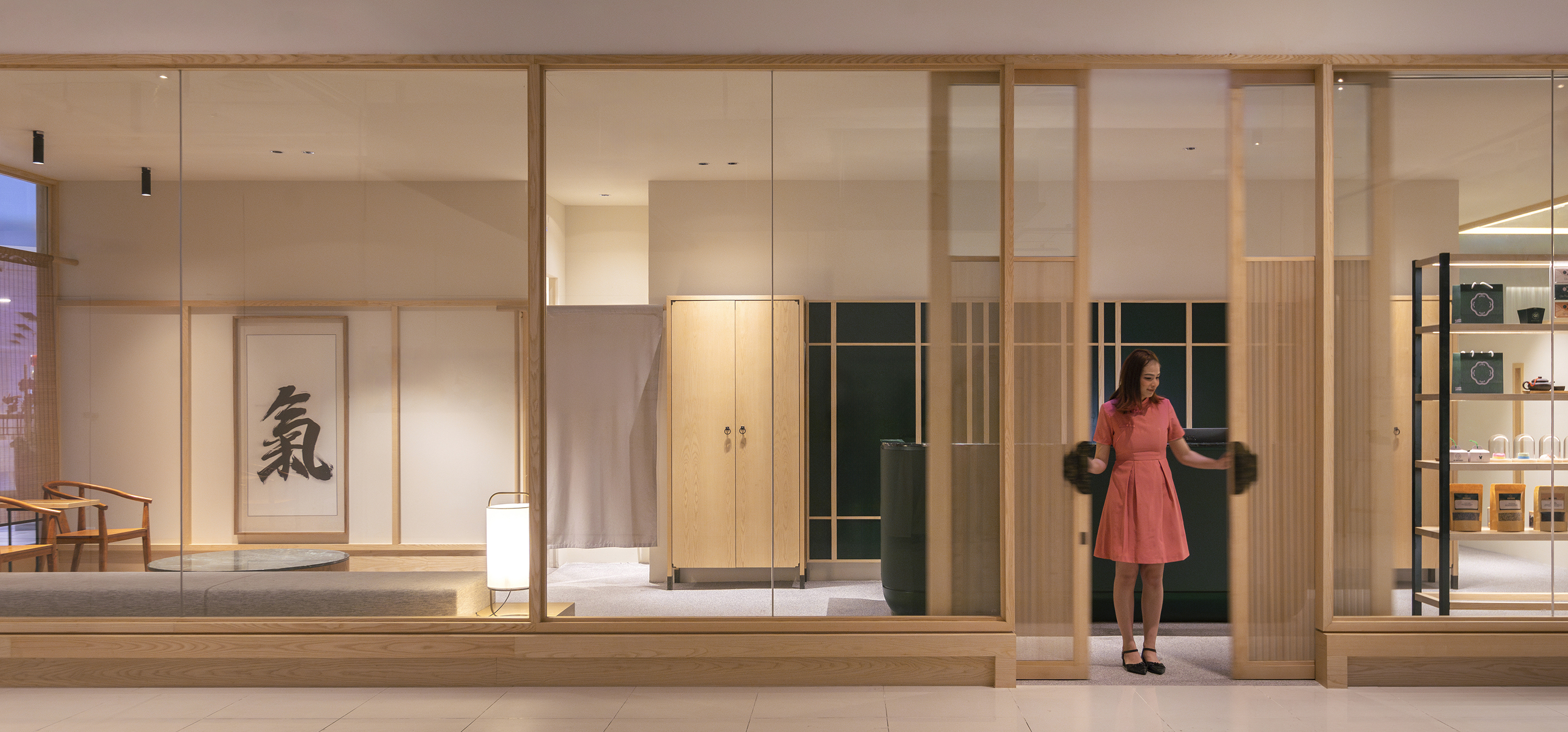 Sister brand to Thai Odyssey, Qi Odyssey emerged out of the market trends of an increasingly younger clientele who are equally into massages and reflexology as well as trendy teahouses and other elements of the modern lifestyle. The color palette of this space is soft and calming, anchored by warm wood tones, muted greens, and minimalist lines.