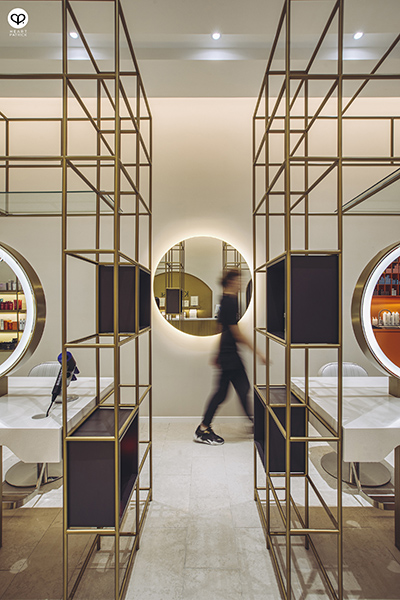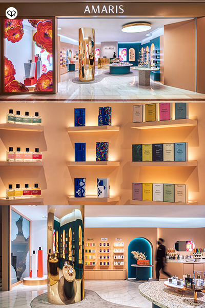 SPACES • MAR 2022 Marking their foray into the Malaysian market, Amaris' first outlet in the country is now opened at Suria KLCC. The dominant pink-green hues of the space gives it a young, modern look while still retaining a taste of luxury with the choice of a gleaming bronze metallic surface in the center column of the outlet.